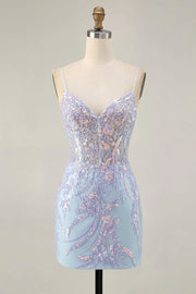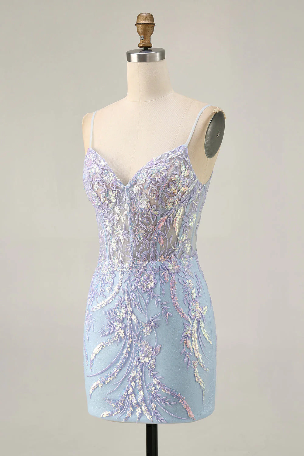 Blue Bodycon Spaghetti Straps Sequins Homecoming Dress with Appliques