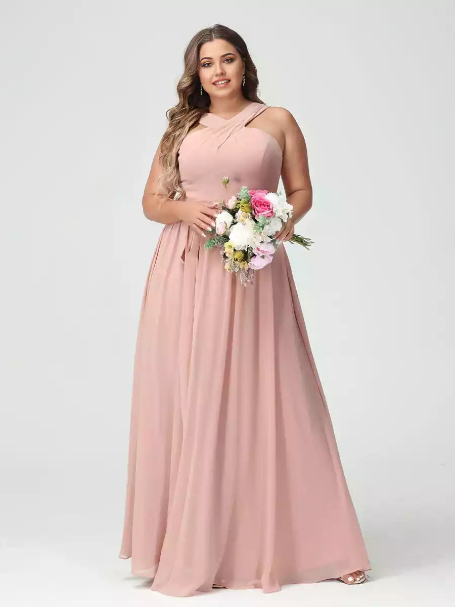 LANQI DRESS charming A-line/princess style cross sleeveless chiffon plus size Bridesmaid Dresses. This plus size dress is made of lightweight fabric, with a cross neck design and a large swing silhouette that exudes elegance and softness. The lightweight fabric comes with a graceful texture, and the cross hanging neck cut showcases charming shoulder and neck lines. The back square collar design adds exquisite details, and the large hem enhances the elegant atmosphere. The fit is suitable for plus size body shapes, comfortable and beautiful, suitable for occasions such as socialite banquets and bridesmaids. It is a high-quality choice to showcase unique temperament and fashion taste.