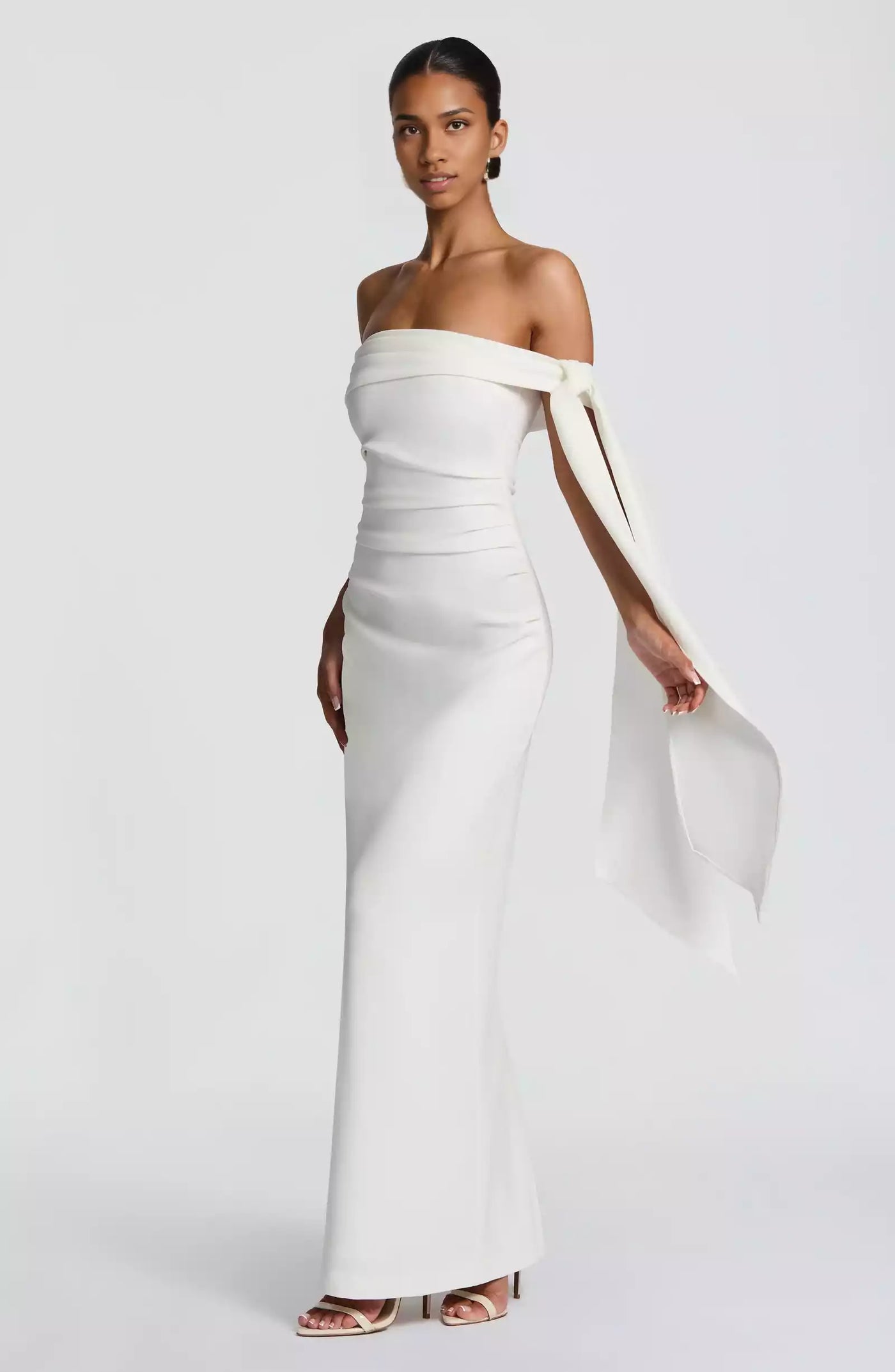 Charming fully lined pleated asymmetrical off shoulder collar with hanging knot and lace details hidden zipper Prom Dresses
