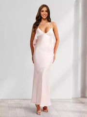 LANQI DRESS's charming slim fit/straight camisole V-neck long elastic satin and ankle Bridesmaid Dresses. This dress is made of satin fabric, with a cross exposed back design and a large bow element, showcasing a sweet and elegant style. The satin material has a high-quality and glossy texture, and the cross exposed back design showcases charming back lines. The large bow decoration adds a sweet and delicate feeling, and the overall cut fits the body shape, making it fashionable and atmospheric. It is suitable for occasions such as socialite banquets and high-end dinners, and is a high-quality choice to showcase unique temperament and fashion taste.
