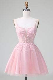 Cute Blush A Line Spaghetti Straps Corset Short Homecoming Dress with Appliques