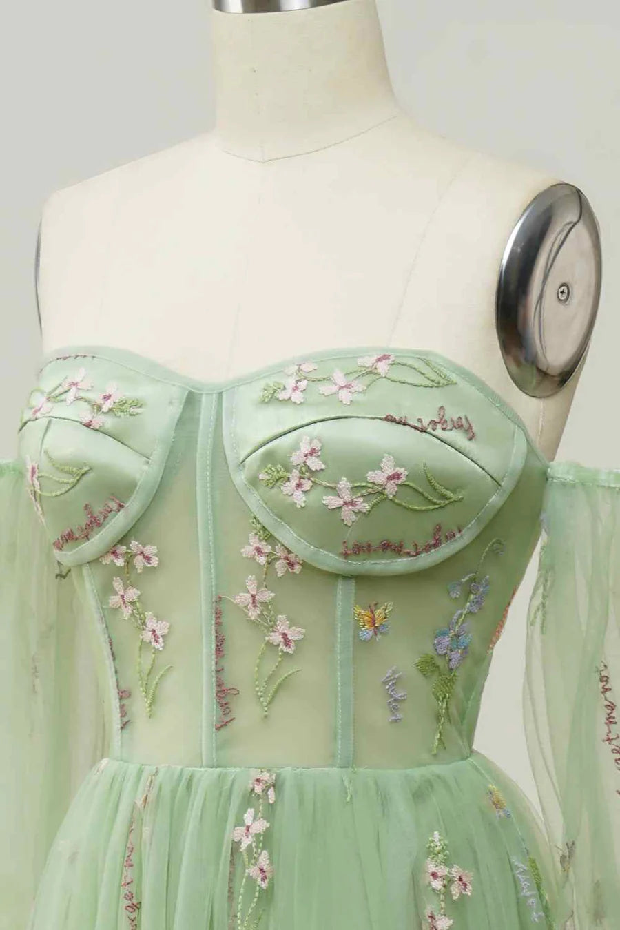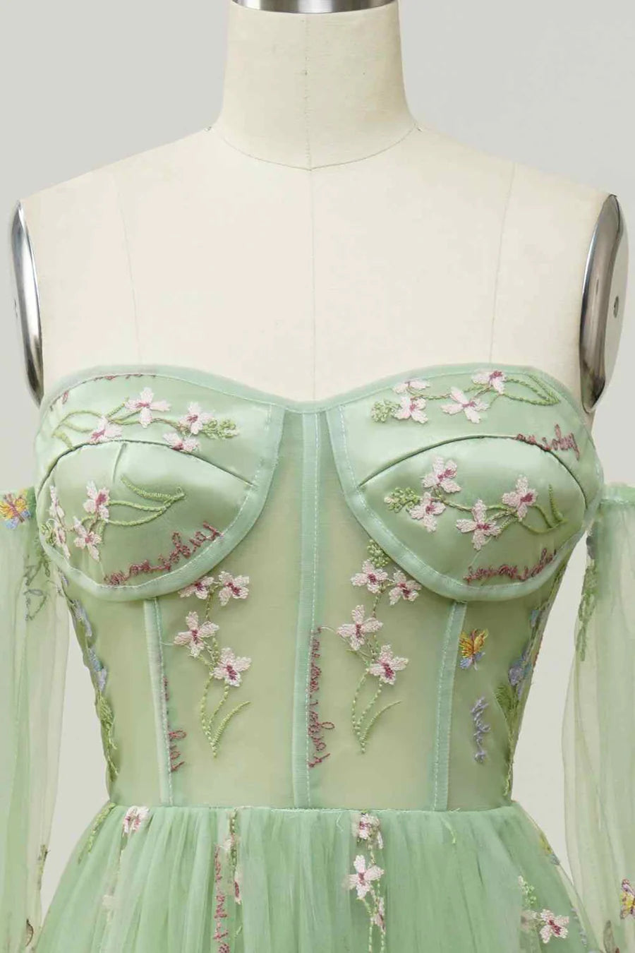 Dusty Sage A-line Off-Shoulder Long Sleeves Tulle Applique Long Prom Dress
