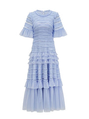 Elegant Short Sleeves Round Neck Layers Blue Long Prom Dress