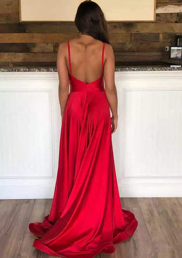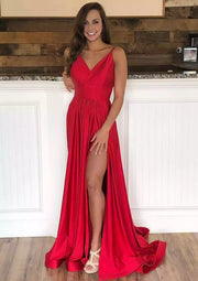 Eye catching A-line sleeveless trailing satin pleated slit Prom Dresses