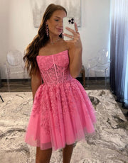 Hot Pink A-Line Strapless Tulle Homecoming Dress With Appliques
