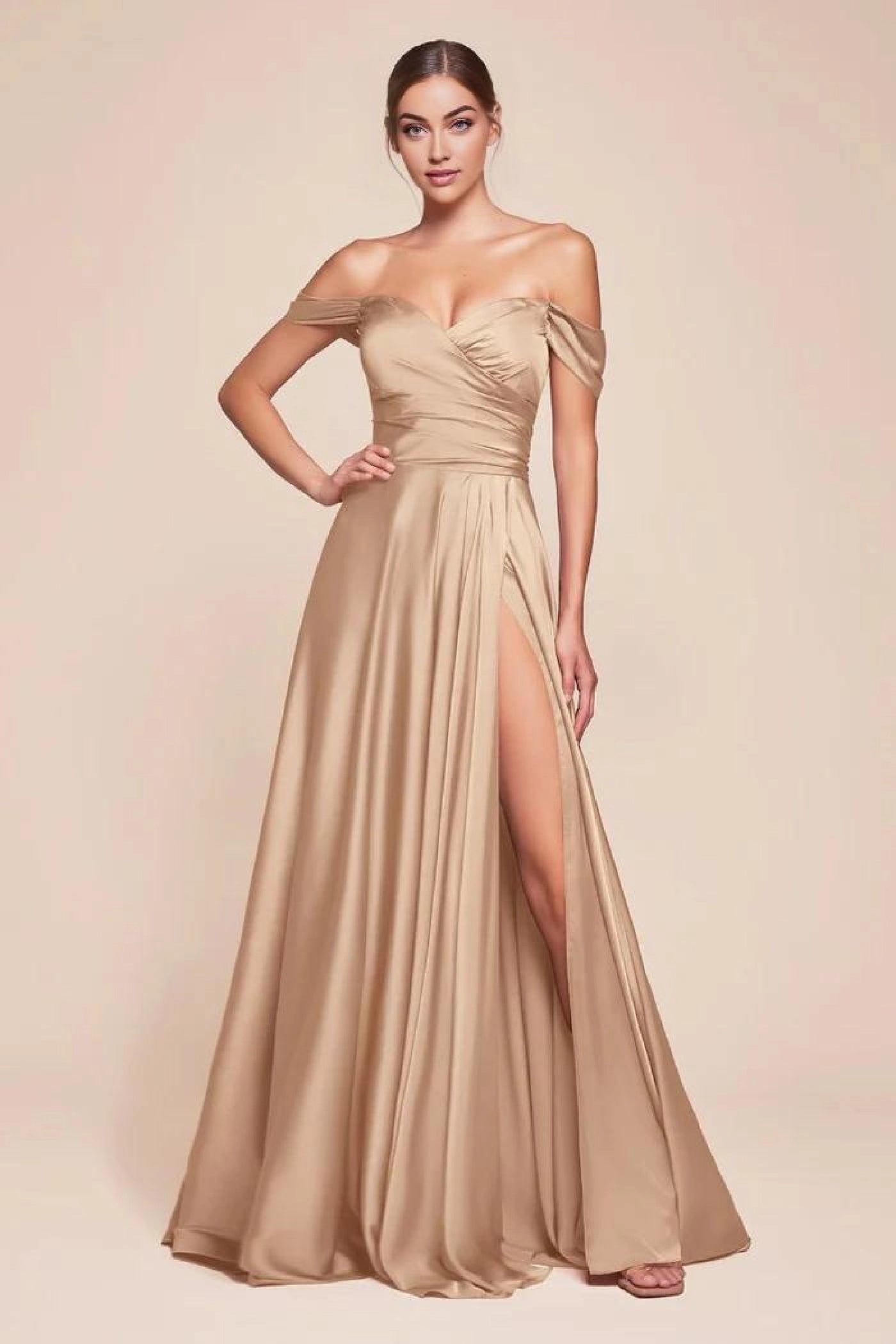JILLIAN GOWN - CHAMPAGNE GOLD - A-LINE SOFT SATIN OFF THE SHOULDER DRESS