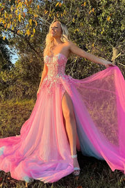Strapless Pink A-Line Appliques Tulle Prom Formal Dress with High Slit