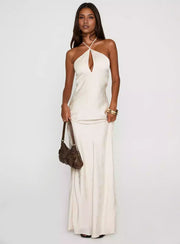 LANQI's stunning floral backless lace up with hollowed out side hidden zipper, adjustable neck strap, backless lace up Prom Dresses. This dress is made of jacquard satin fabric, with a hanging neck, hollowed out chest, and exposed back design paired with a long silhouette, showcasing an elegant retro style. Jacquard satin comes with delicate texture and luster, with a hanging neck cut that accentuates the shoulder and neck lines. The hollowed out and backless design enhances the delicate atmosphere, while the hanging skirt fits the body and naturally displays a gentle temperament. It is suitable for occasions such as light luxury dinners and retro themed weddings, and is a high-quality choice for showcasing fashion taste and elegant style.