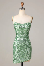 Stylish Green Bodycon Spaghetti Straps Backless Sequins Short Homecoming Dress