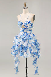 White Blue Flower A-Line Halter Cut Out Short Homecoming Dress with Pearls