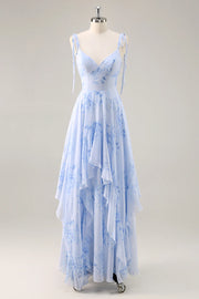 A-Line Spaghetti Straps Long Blue Floral Bridesmaid Dress with Ruffles