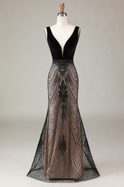 Black Mermaid Deep V Neck Sequins Long Evening Party Dress