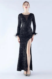 Black Mermaid Sequin Feather Long-Sleeve Evening Dress With Slit