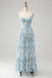 Blue Floral A-Line Strapless Pleated Long Prom Dress With Slit