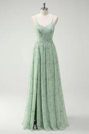 Dusty Sage A-Line Spaghetti Straps Pleated Print Long Bridesmaid Dress with Slit
