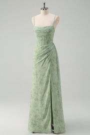 Dusty Sage Sheath Spaghetti Straps Pleated Long Bridesmaid Dress with Slit
