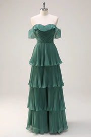 Eucalyptus A-Line Off The Shoulder Tiered Pleated Floor Length Bridesmaid Dress