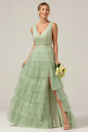 Grey Green Tulle A-Line V Neck Tiered Maxi Dress With Slit