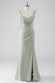 Sage Green Sheath Ruffled Lace-Up Back Long Bridesmaid Dress with Slit