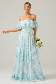 White Blue Floral A Line Off The Shoulder Tiered Maxi Dress
