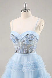 A-Line Sequins Tulle Corset Pleated Short Blue Homecoming Dress with Ruffles - US 2 / UK 6 / EU 32