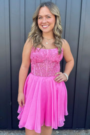 Pink A-Line Strapless Lace Top Short Tulle Homecoming Dress