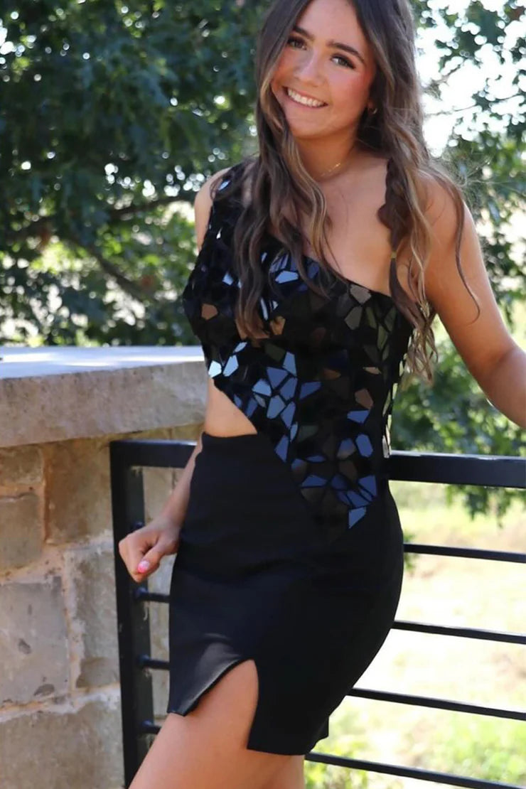 Cute Bodycon One Shoulder Black Satin Short Unique Design Homecoming Dress