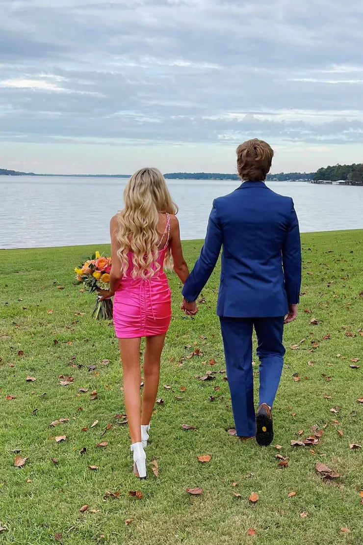 Cute Bodycon V Neck Hot Pink Satin Short Full Of Charm Homecoming Dress