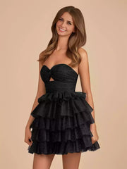 LANQI's exquisite hollowed out A-line chiffon heart-shaped neckline with layered ruffle edges and sleeveless lace up at the back, Homecoming Dresses. This short skirt is cool and sweet. The strapless design reveals charming shoulders and neck, while the hollow chest adds a touch of sexiness. The multi-layered cake skirt is light and agile, and the full body sequins shine brilliantly in the light. The back strap design not only adjusts the elasticity, but also has high decorative value, with a premium texture. Whether it's a party, a date, or an important occasion, it can easily make you the center of attention and unleash your unique charm of coolness and sweetness.