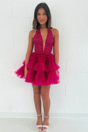 Halter Plunging V-Neck Sleeveless Ruffles Short Homecoming Dress