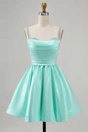 Mint Green A-Line Spaghetti Straps Beaded Satin Short Homecoming Dress