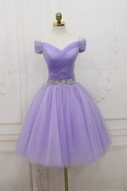 Purple Tulle Beaded Short Prom Dress, Off Shoulder Party Dress