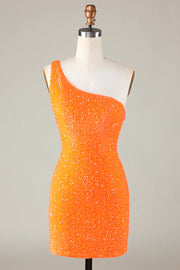 Sequins One-Shoulder Orange Tight Beading Short Full Of Charm Homecoing Dress
