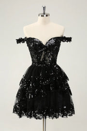 Sparkly Black A Line Off The Shoulder Corset Tiered Short Homecoming Dress