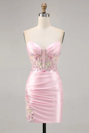 Sparkly Candy Pink Satin Floral Strapless Corset Short Homecoming Dress