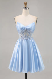 Sparkly Light Blue Satin Strapless Corset Short Homecoming Dress with Lace