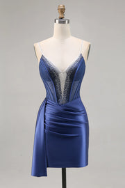 Sparkly Navy Corset Satin Tight Beaded Homecoming Dress with Streamer