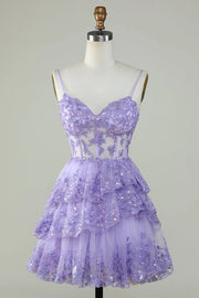 Sparkly Purple A Line Spaghetti Straps Tiered Corset Short Homecoming Dress