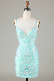 Sparkly Tight Spaghetti Straps Green Homecoming Dress with Backless