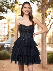 LANQI's stunning off shoulder A-line sheer short sleeveless decal, sequined lace up back Homecoming Dresses. This short skirt is mysterious and gorgeous. The strapless design reveals charming shoulders, necks, and collarbones, while lace and sequin decorations add delicacy and radiance. The multi-layered mesh skirt is agile and elegant, and the backless strap design exudes a small sensuality and high-end texture. Whether it's a party, a date, or an important occasion, it can easily make you the center of attention and unleash your mysterious and gorgeous unique charm.