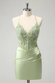 Stylish Green Sheath Criss Cross Back Corset Short Homecoming Dress with Applique