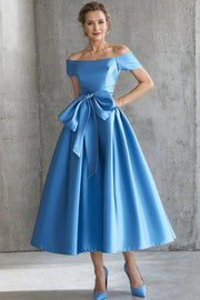 Off the Shoulder Tea Length Blue Mother Of The Bride Dress with Bow