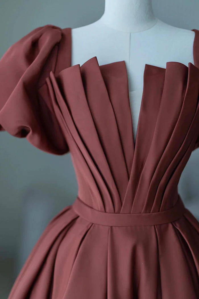 A-Line Satin Long Prom Dress, Elegant Short Sleeve Evening Party Dress
