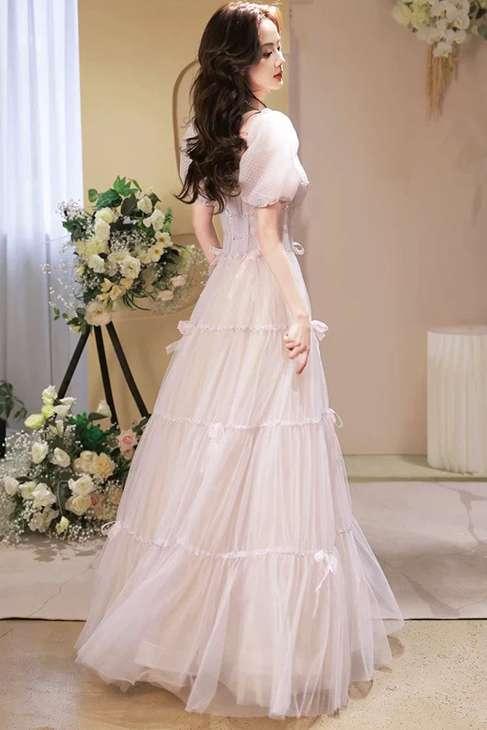 Beautiful A-Line Tulle Long Prom Dress, A-Line Short Sleeve Evening Party Dress