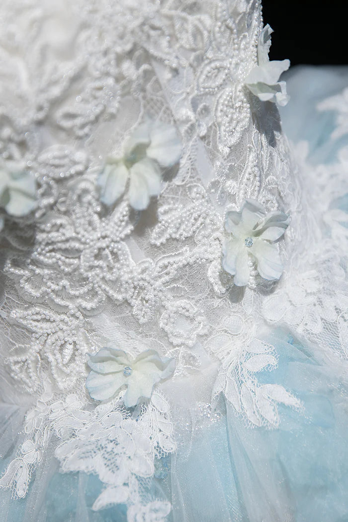Beautiful Blue Glitter Lace Flower Prom Dress, A-Line Strapless Evening Party Dress