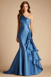 Blue Mermaid Satin Long One Shoulder Wedding Evening Dresses