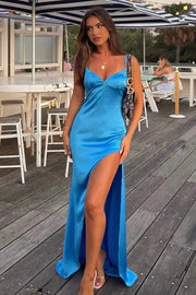 Blue V-Neck Sleeveless Backless Mermaid Party Prom Dress With Slit