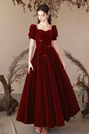 Burgundy Velvet Long Party Dress, A-Line Short Sleeve Evening Prom Dress