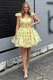 Cap Sleeves Yellow Floral Print A-Line Homecoming Dress