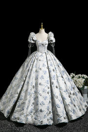Elegant Floral Pattern Floor Length Prom Dress, A-Line Short Sleeve Party Dress